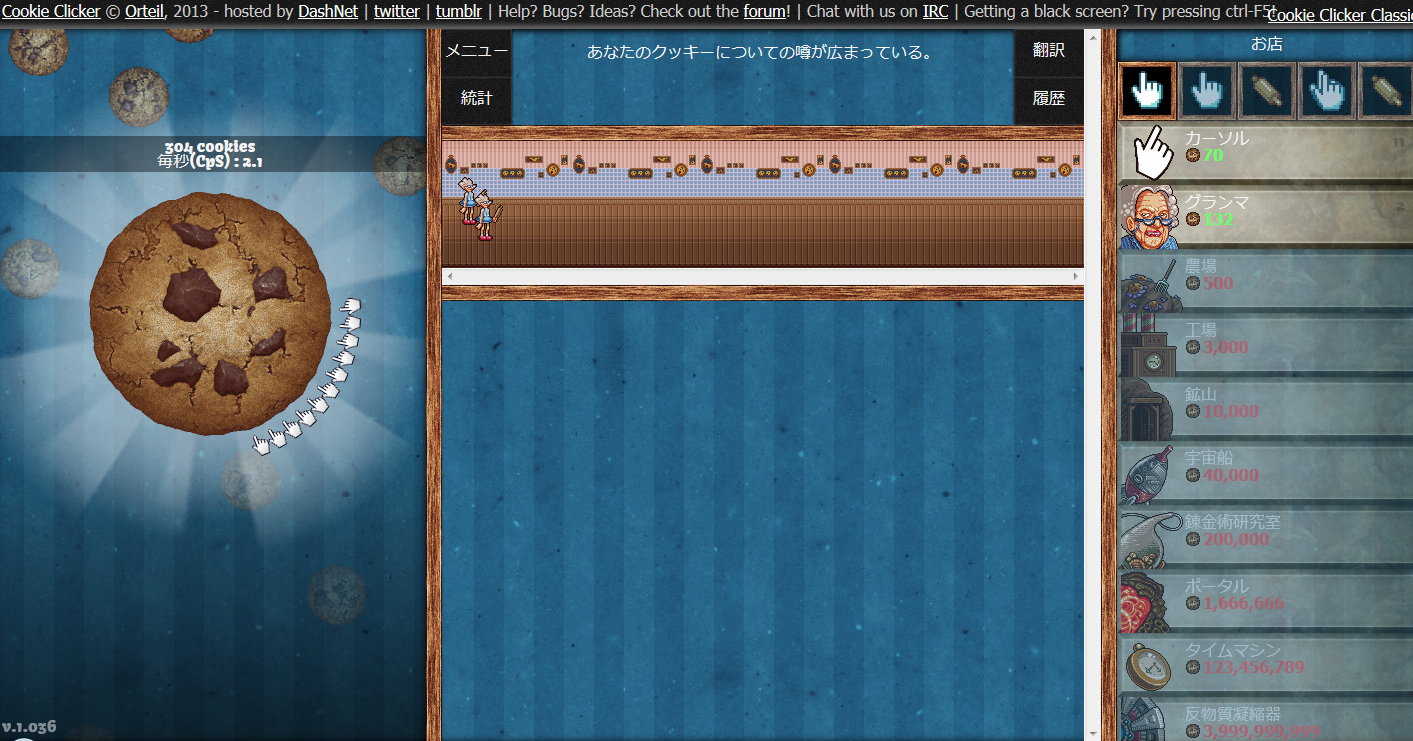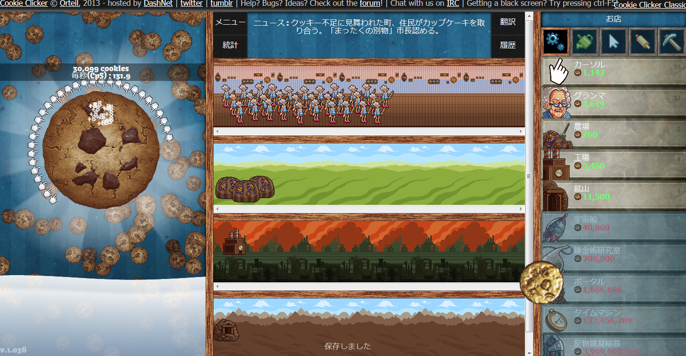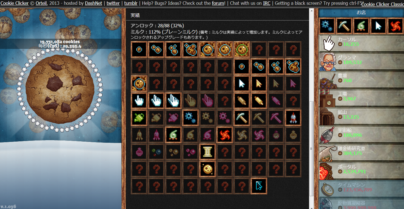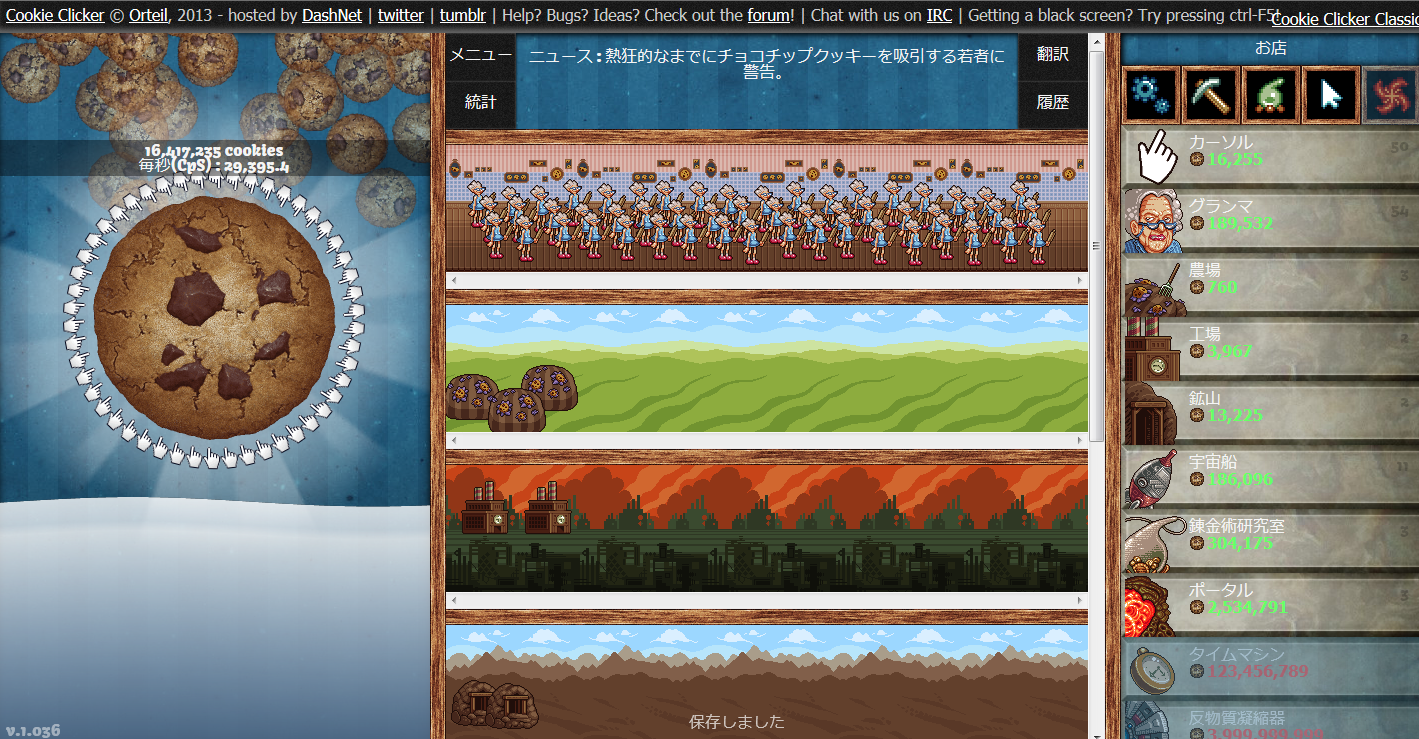 クッキーを作ってくれるナイスなおばあちゃん! クリック連打で大量生産! クッキーを果てしなく作り続けよう!! というわけで、巷で噂のフリーブラウザゲーム『クッキークリッカー』をやってみました。 今更感があるのは気にしないでくださいw クッキークリッカーとは、Orteil氏に開発されたフリーのブラウザゲーム。 クッキーをひたすらクリックし、出来上がったクッキーでコンテンツを買い、そこからまたクッキーを増やし続ける…というだけのゲームです。 ここでは、実際にプレイしてみての感想的なのを簡単にかつざっくりと書くので、詳しいゲームのシステムや攻略などはほかのサイト様に頼ってください。。。 本家はすべて英語表記になっていてやりづらさがあったので、日本語翻訳をしてくださった有志の方のページでプレイしました。 ちなみに、やり始めのうちはTwitterで実況的なことをしてました。 やり始めて約5分後の様子です。 まだカーソルが少しと、おばあちゃんが2人という少し寂しい状態です。 ゲームの簡単な説明は、 ・画面左のでかいクッキーをクリックでクッキーを生産 ・画面右が「お店」になっている 下にずらずらと並んでいるのはクッキー作りを手助けしてくれる人や設備たち(コンテンツ) 上の四角いアイコンはコンテンツをパワーアップさせるツール ・「お店」での購入はいままで作ったクッキーを消費 ・画面真ん中に購入したコンテンツが表示される と、大体こんな感じです。 クッキーのさらなる生産は、10秒に1クリックしてくれるカーソルに始まり、クッキーを勝手に焼いてくれるナイスなおばあちゃんに手伝ってもらうほか、工場や、宇宙船、クッキー次元につながるポータル、タイムマシン、そして反物質凝縮機を酷使して生産していきます。 このゲームはクッキーを作るだけという一見つまらなさそうですが、自分が作ってきたクッキーを使って、コンテンツを購入します。それによって自動生産が強化され、一秒間に作られるクッキーの量(CpS:Cookies per second)が増えていきます。 それに加え、コンテンツをパワーアップさせることで更に生産効率をアップさせることができます。 そして、そこから更にクッキーを作っていきます。 自分が作ったクッキーをやりくりして、頂上の見えないクッキー作りの高みを目指していくのです。 また、この「クッキークリッカー」にもボーナス要素があり、たまに画面のどこかに出現する『金のクッキー』をとることで、大量のクッキーを得られたり、一定時間クッキーの生産量が倍になったりという嬉しい要素があります。 画面右下らへんにあるのが『金のクッキー』です。 クリック連打というシンプルな操作でありながら、自分が作ったクッキーをやりくりしてコンテンツを充実させて果てしなくクッキーを作りづつけるのです。 シンプルな操作、自らのクッキーを使っての生産効率化、限界無きクッキー作りの挑戦、これらがこのゲームの面白さだと思います。 プレイを開始して約三時間後の様子がこれです。 29,395.4cpsにまで成長?しました。 もうおばあちゃんが大勢いますね ちなみに、実績がこちら まずまずと言った感じでしょうか この実績の画面をみて初めてミルクの効果を知りましたw やっているうちにだんだんと面白くなってくるこのゲーム、「クッキークリッカー」 この記事が書き終わったらまたプレイしようと思いますw クッキークリッカー本家 http://orteil.dashnet.org/cookieclicker/ クッキークリッカー非公式日本語版 http://cafe-capy.net/cookieclicker/ CookieClickerとは (クッキークリッカーとは) [単語記事] - ニコニコ大百科 http://dic.nicovideo.jp/a/cookieclicker PR |