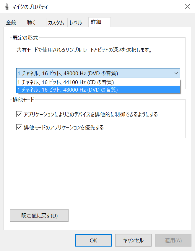 今回のPCはいつも使っているものとは別のため、接続したすぐは「1チャンネル、16ビット、44100Hz(CDの音質)」が設定されていました。